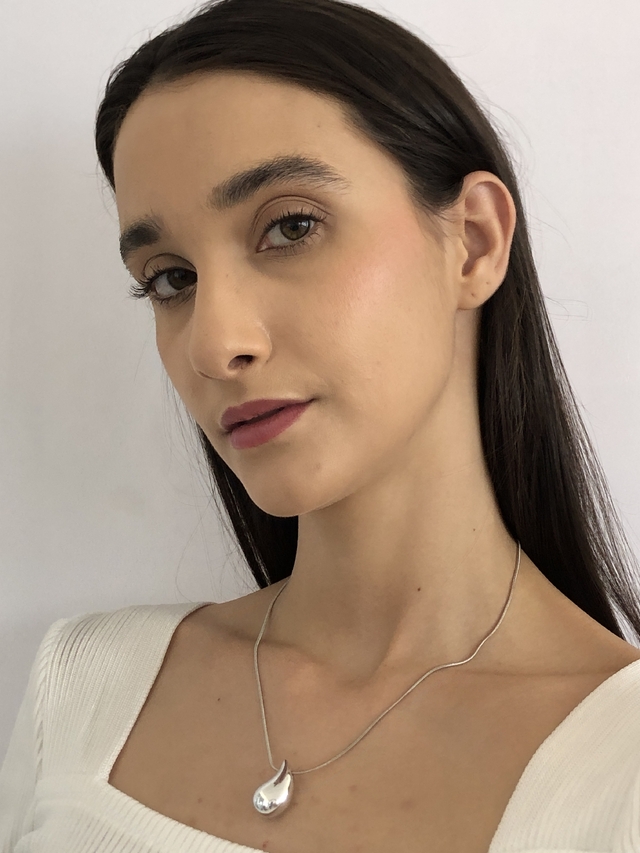 -O colar mede 1 mm de largura, e o pingente de gota mede 2,3 cm de comprimento e 1,5 cm de largura.